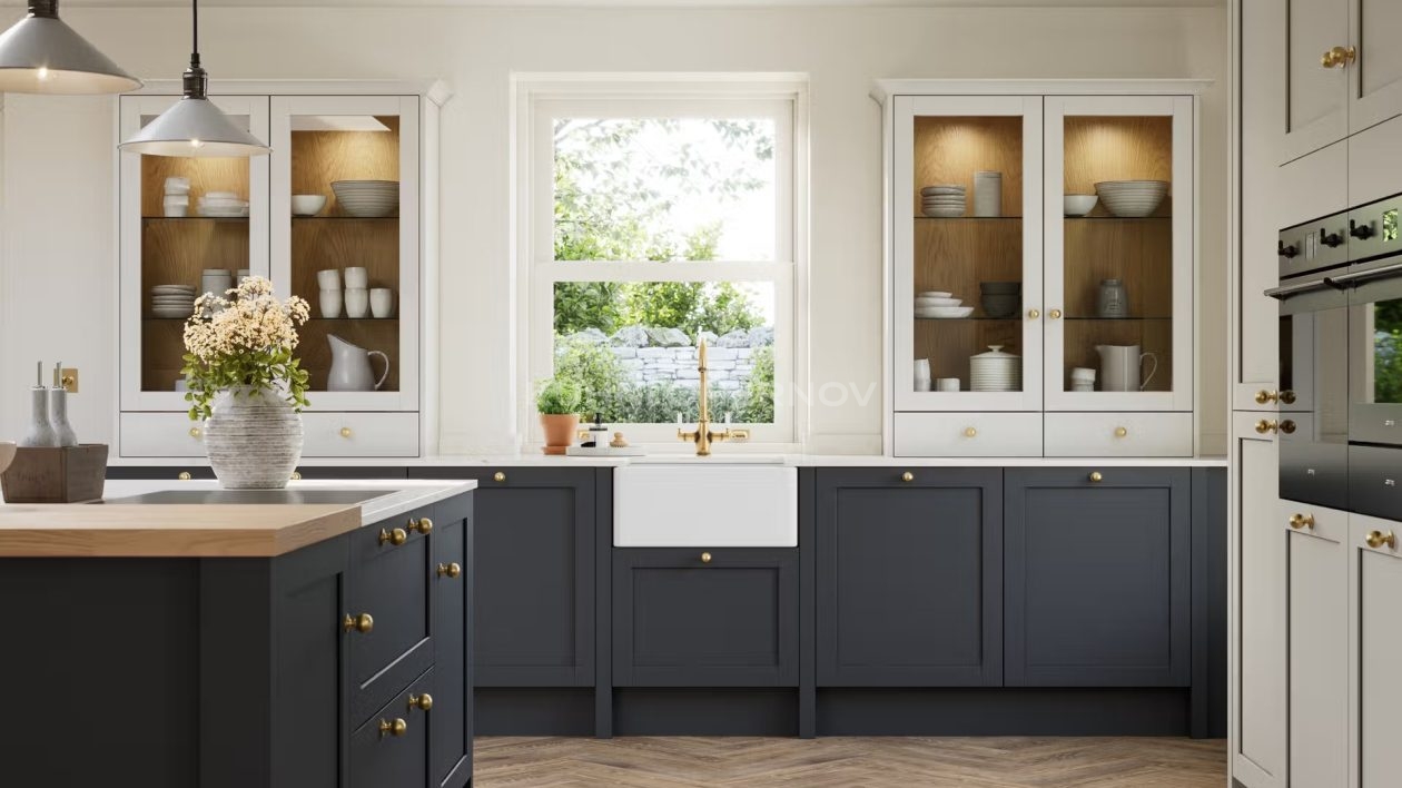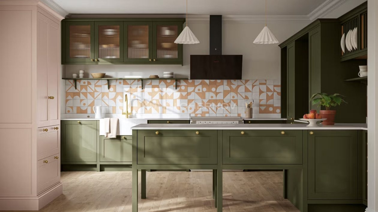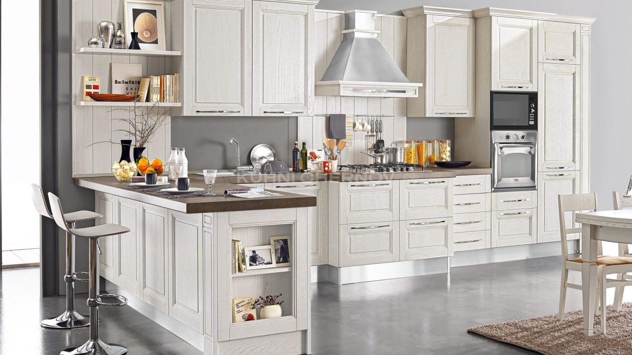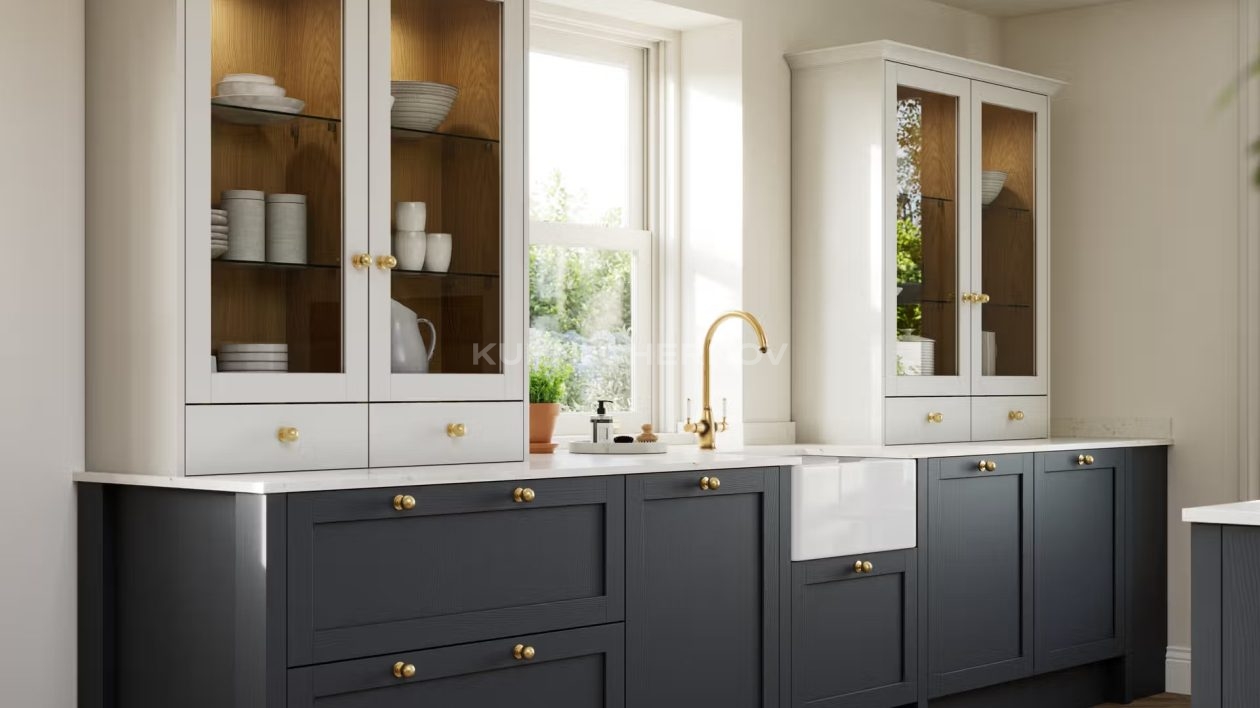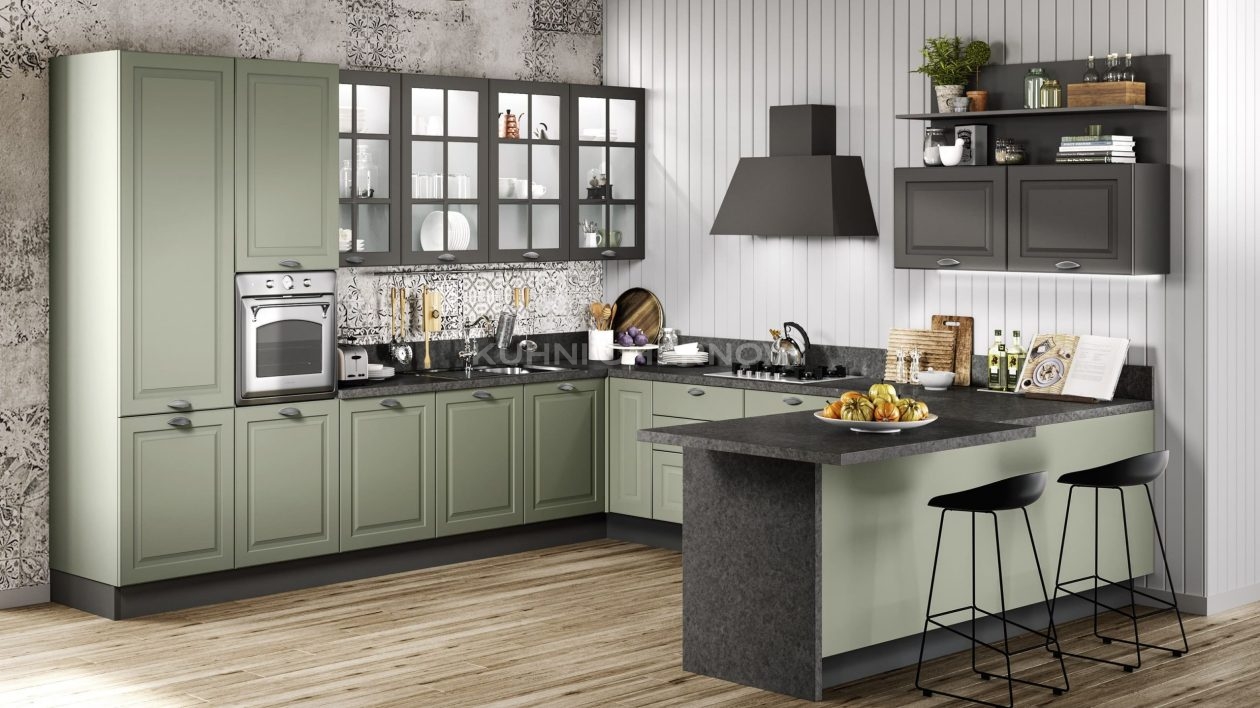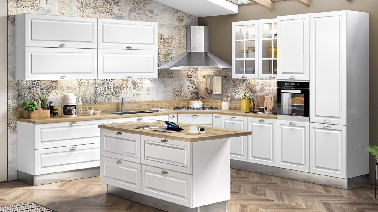- классика — филенчатые фасады, патинированные ручки, теплые тона дерева;